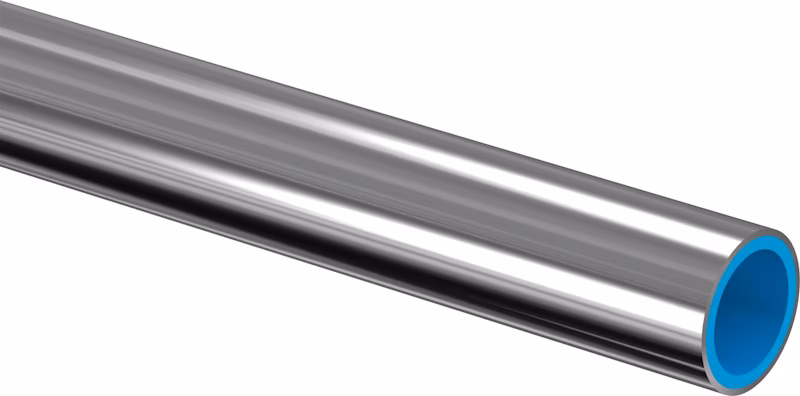 Uponor Metallic Pipe PLUS -komposiittiputki kromin värisenä. Putki soveltuu erinomaisesti käyttövesi- ja lämmitysremonttien pinta-asennukseen. Nyt voit tehdä käyttövesiremontin alusta loppuun samalla putkimateriaalilla. Putkea taivutetaan samalla tavalla kuin valkoista komposiittiputkea Uponorin taivutustyökalulla. Samat messinki- ja PPSU-liittimet käyvät kromikomposiittiputken liitoksiin. Jatkuva lämpötilankesto on 70 °C, hetkellisesti 95 °C. Paineenkesto on 10 bar. Uponor Metallic Pipe PLUS -komposiittiputkissa on PE-kerrosten välissä saumaton alumiinikerros. Putkessa yhdistyvät muovin syöpymättömyys ja metallin muodonpysyvyys ja lujuus.