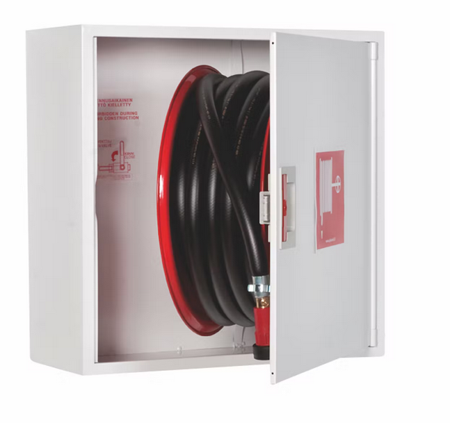 PV-10/19MM 25M/VALK. Pintamallin kaappi voidaan osittain upottaa haluttuun syvyyteen käyttämällä erillistä upotuskehystä. CE-merkitty (EN 671-1:2012) pikapalopostikela on aina punainen ja letkun pituus on enintään 30m.